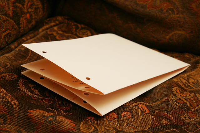 Fold into fours, vertically first, then horizontally. Punch two holes at the top.
