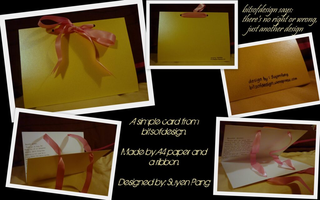 Simplicity brings out the beauty in things. Min, a very dear friend of mine was leaving for Korea and in the midst of my huge workload, I wanted to make her a farewell card. This was done in 5 minutes and I thought it was something quite simple and easy to do, but beautiful at the same time. So I will like to share it with you. I used an A3 card stock and folded it into fours. We later wrote all of our messages inside.