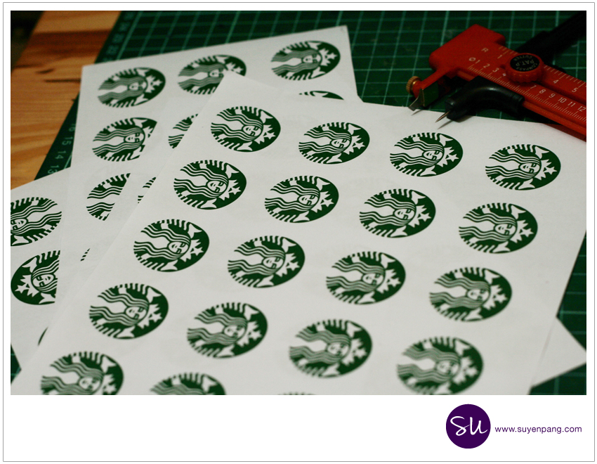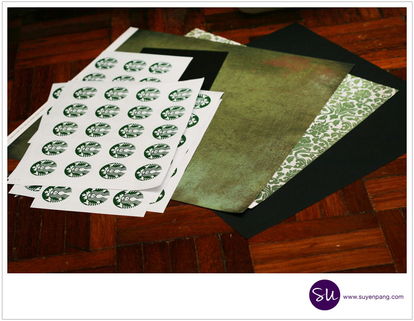 Started by selecting a few pieces of green patterned cardstock and printed some Starbucks logos in different sizes.